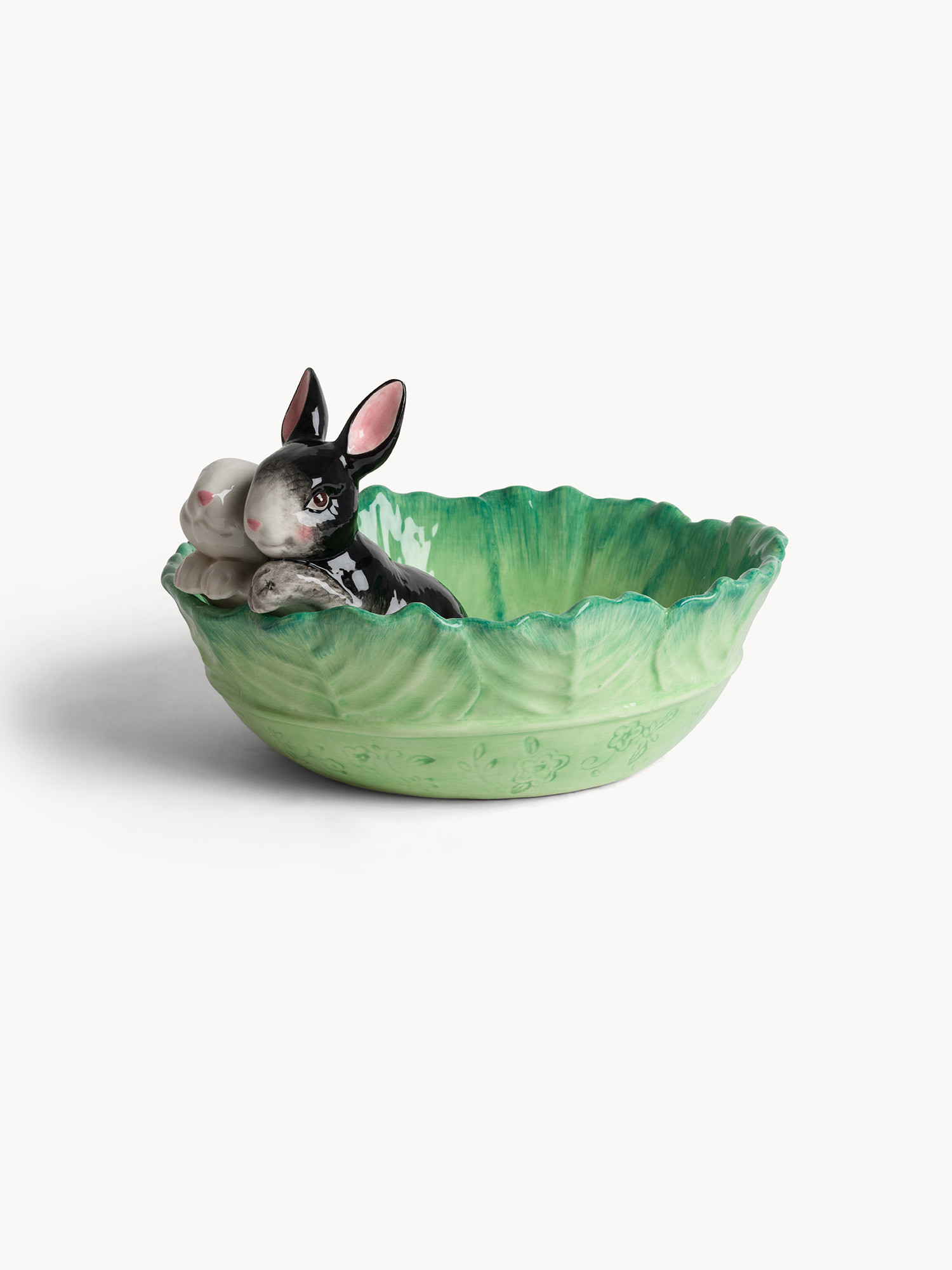 Coppa in ceramica a foglia con conigli applicati