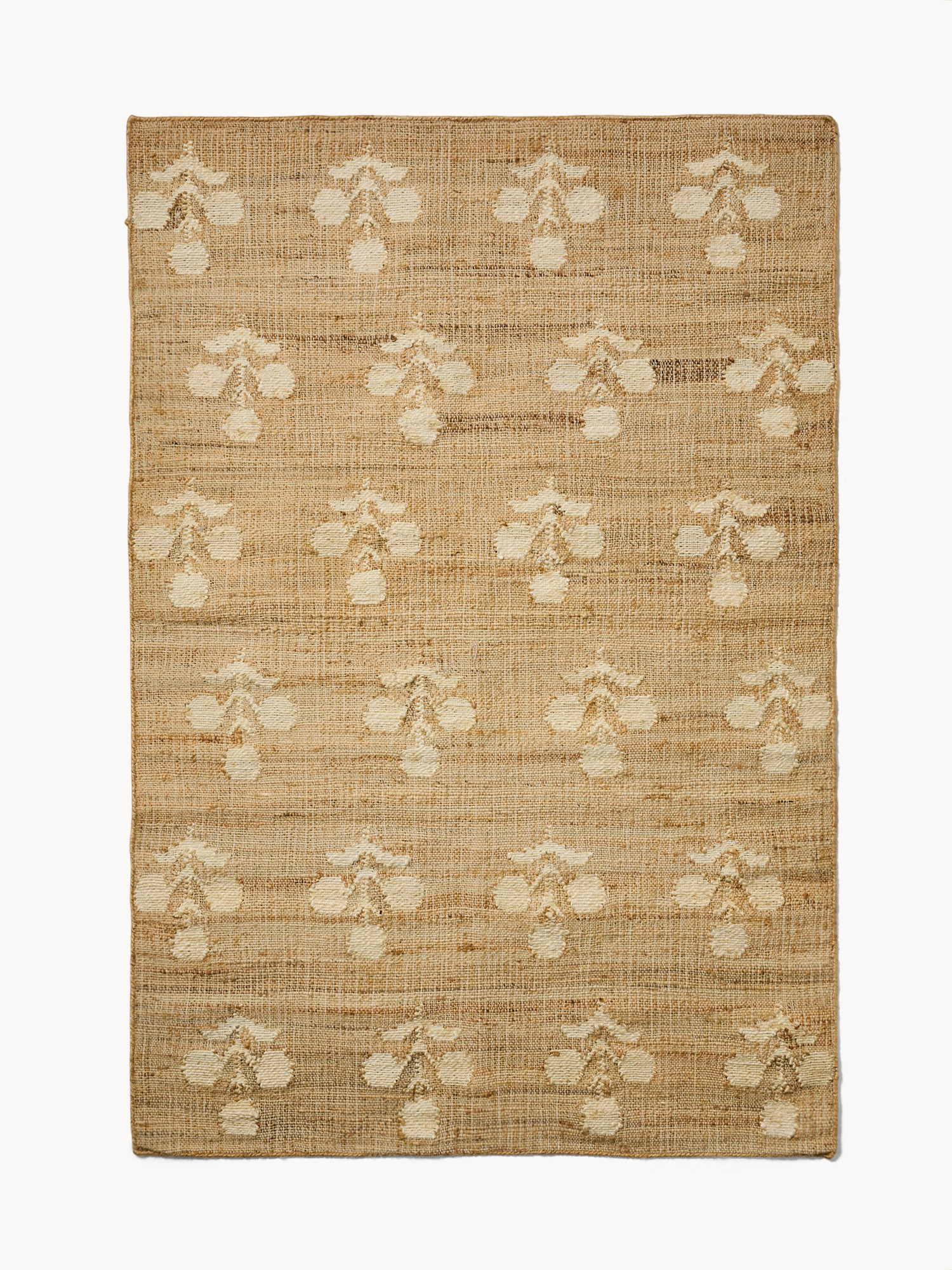 Tappeto rettangolare in 100% iuta con fiori bianchi