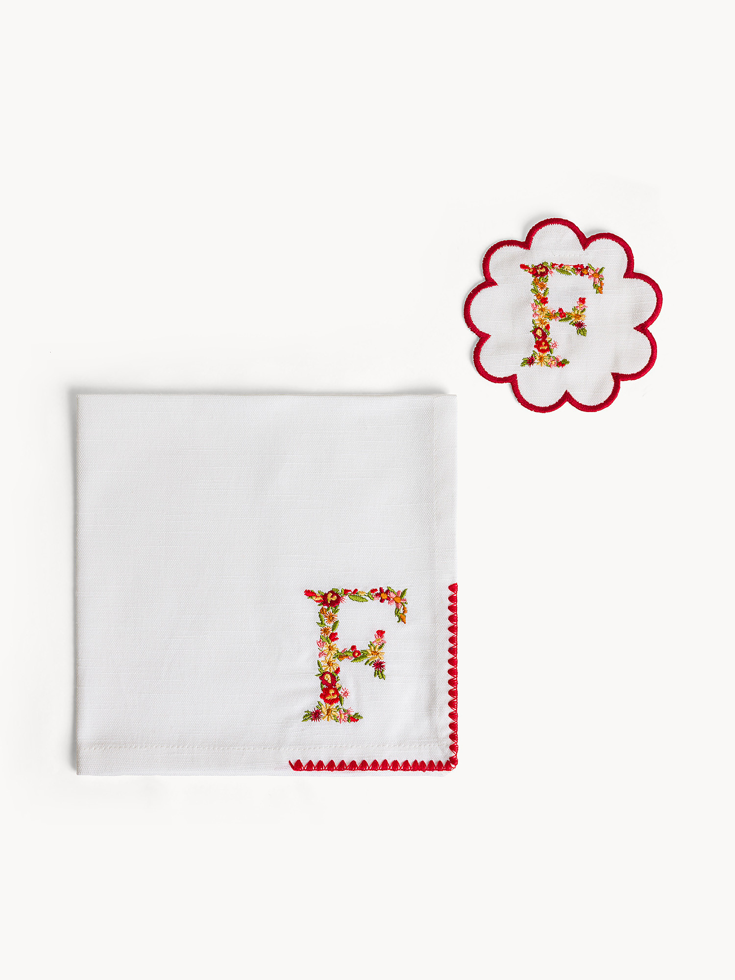 Set tovagliolo e sottobicchiere lettera ricamata F