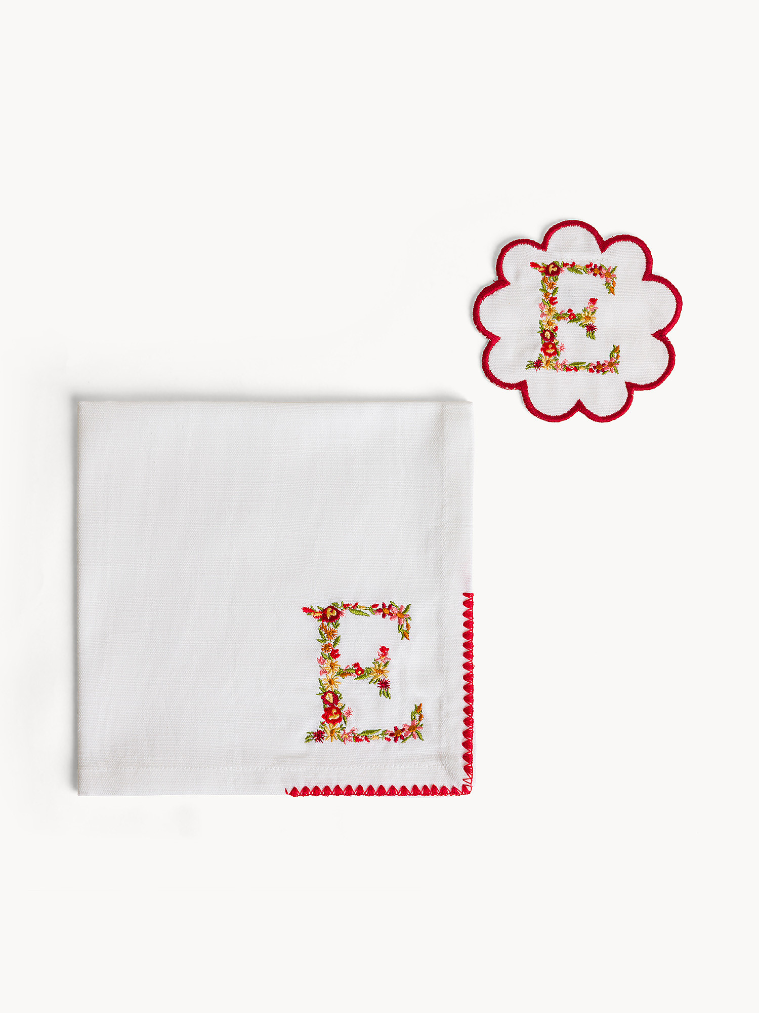 Set tovagliolo e sottobicchiere lettera ricamata E